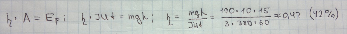 Транспортер за 60с поднимает груз массой 190кг на высоту 15м. Определите КПД траспортера, если известно, что при напряжении в сети 380 В он потребляет ток силой 3,0А.