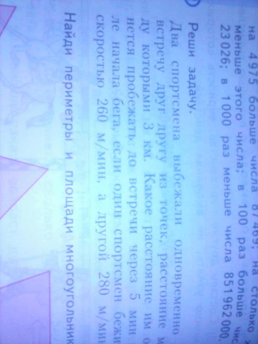 два спортсмена выбежали одновременно на встречу друг другу из точек растояние между которыми 3 км. какое растояние им останется пробежать до всречи. через5 минут после начала бега, если один спортсмен бежал 260м/мин, а другой 280м/мин
