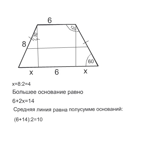 В равнобедренной трапеции один из углов равен 120 градусов,боковая сторона 8,а меньшее основание 6.Найти среднею линию трапеции.