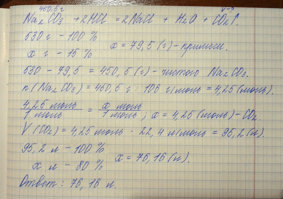 3. Найти объём выделившегося газа, который можно получить, если к 530г карбоната натрия, содержащему 15% примесей, добавить раствор соляной кислоты. Выход газа составляет 80% от теоретического