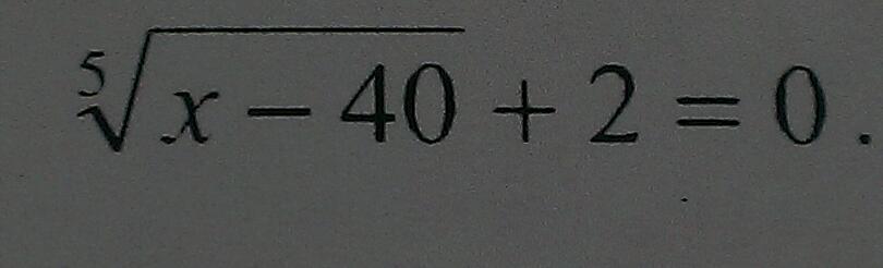 sqrt[5]{x-40}+2=0 \ x-40+2^5=0 \ x-40+32=0 \ x-8=0 \ x=8