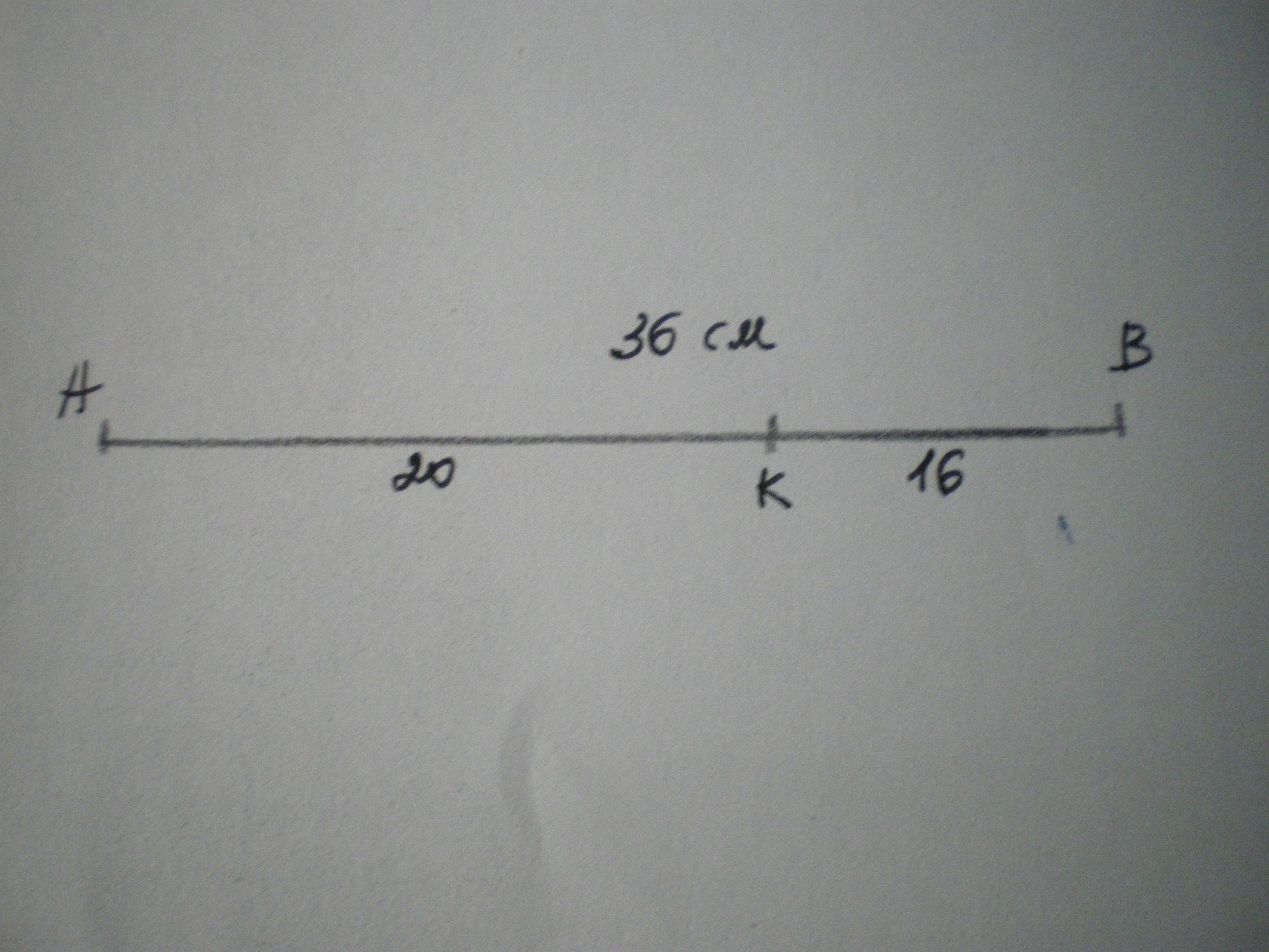 На отрезке АВ длиной 36см взята точка К. Найдите длины отрезков АК и ВК, если АК больше ВК на 4см