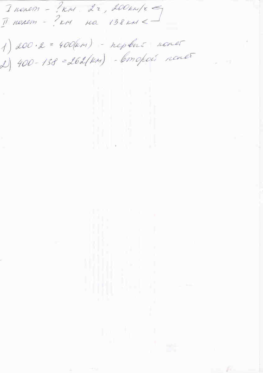 спасательный вертолет совершил 2 вылета. в первый раз он летал 2ч со скоростью 200кмч.во время 2-го вылета вертолет пролетел на 138км меньше. сколько километров пролетел вертолет. с кратким записем.