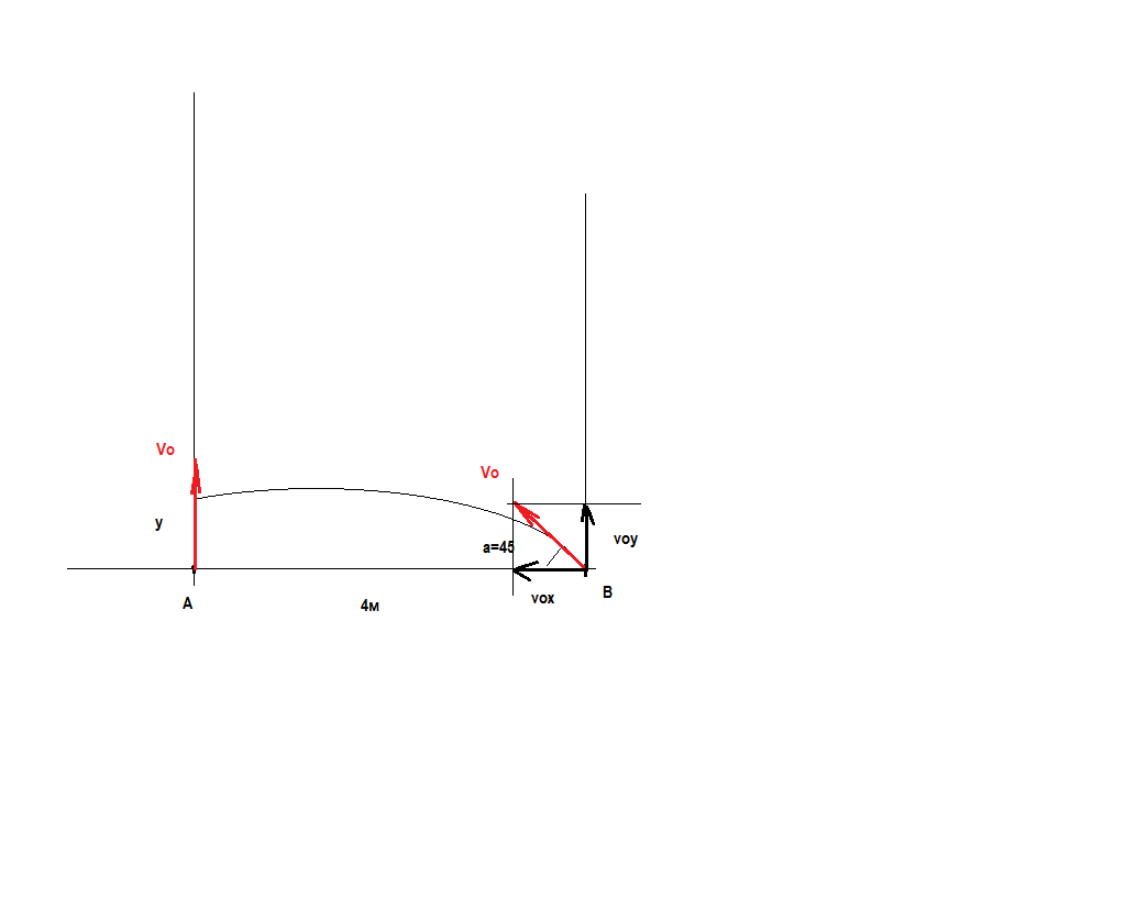 Из точки A вертикально вверх брошен камень со скоростью 10 м/с. Через какое время следует бросить с той же по модулю скоростью второй камень из точки B под углом 45 градусов к горизонту, чтобы он попал в первый камень? Точки A и B расположены на земле, расстояние между ними 4 м.