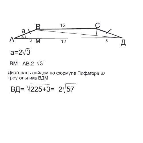 В равнобокой трапеции АВСД основания АД и ВС соответственно равны 18 см и 12 см , а боковая сторона образует угол 30 градусов.Найдите диагональ трапеции