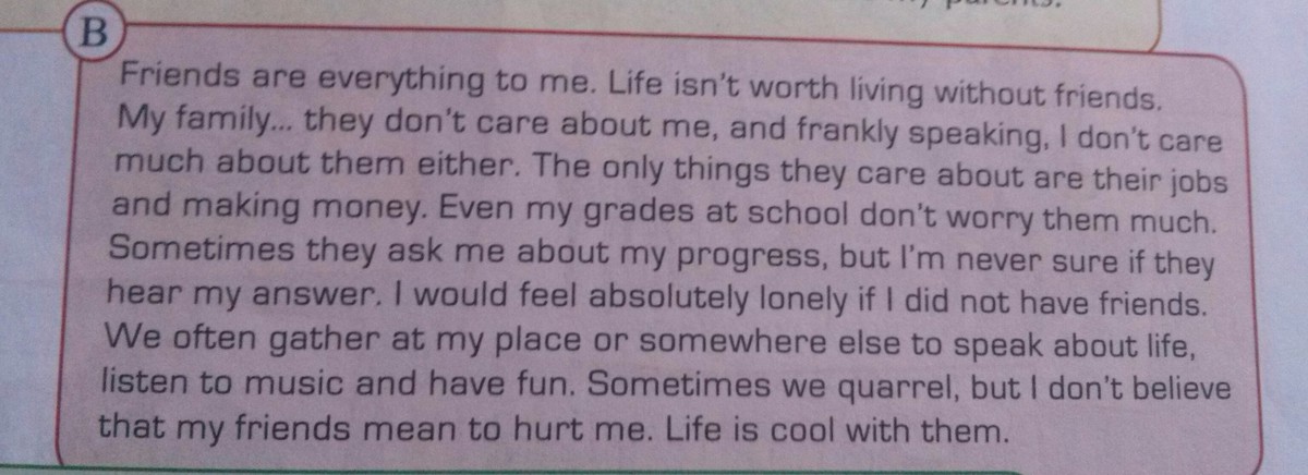 Друзья для меня все. Не стоит жить без друзей. Моя семья... им нет дела до меня, и, честно говоря, я тоже не сильно беспокоюсь о них. Единственное, о чем они беспокоятся - это их работы и зарабатывание денег. даже мои достижения в школе их не волнуют. Иногда они спрашивают о моем прогрессе, но я не уверена, что они меня всегда слушают. Я бы чувствовала себя такой одинокой без друзей. Мы всегда собираемся у меня или еще где поговорить о жизни, послушать музыку или повеселиться.Иногда мы ссоримся, но я не думаю, что друзья хотят меня обидеть.Жизнь такая классная с ними!