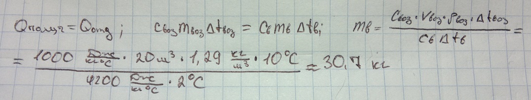 При включении отопления воздух в комнате объемом 20 метров в кубе нагрелся от 10 до 20 градусов . Какая масса воды прошла через отопительные батареи ,если вода в батареи остывает от 60 до 58 градусов ?