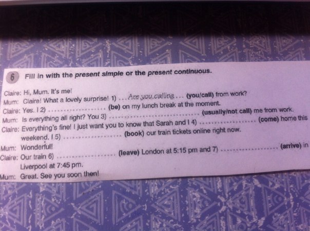 I am on my lunch break at the moment. You usually call me from work. Sarah and I are coming home this weekend. I am booking our tickets online right now. Our train is leaving London at 5.15p.m. And arriving in Liverpool at 7.45p.m