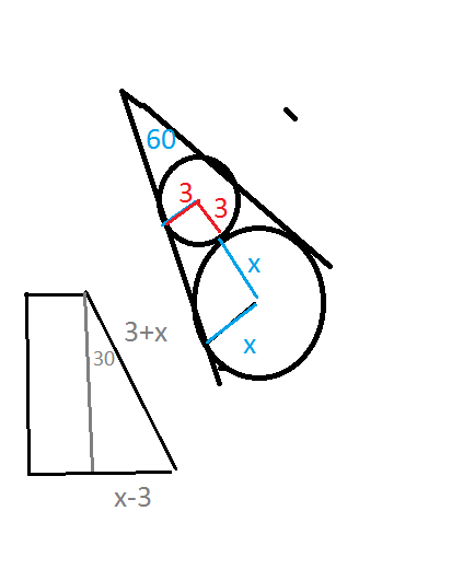 Две окружности,которые имеют внешнее прикосновение,вписаны в угол 60 градусов,найти радиус большей окружности,если радиус меньшей 3 см.