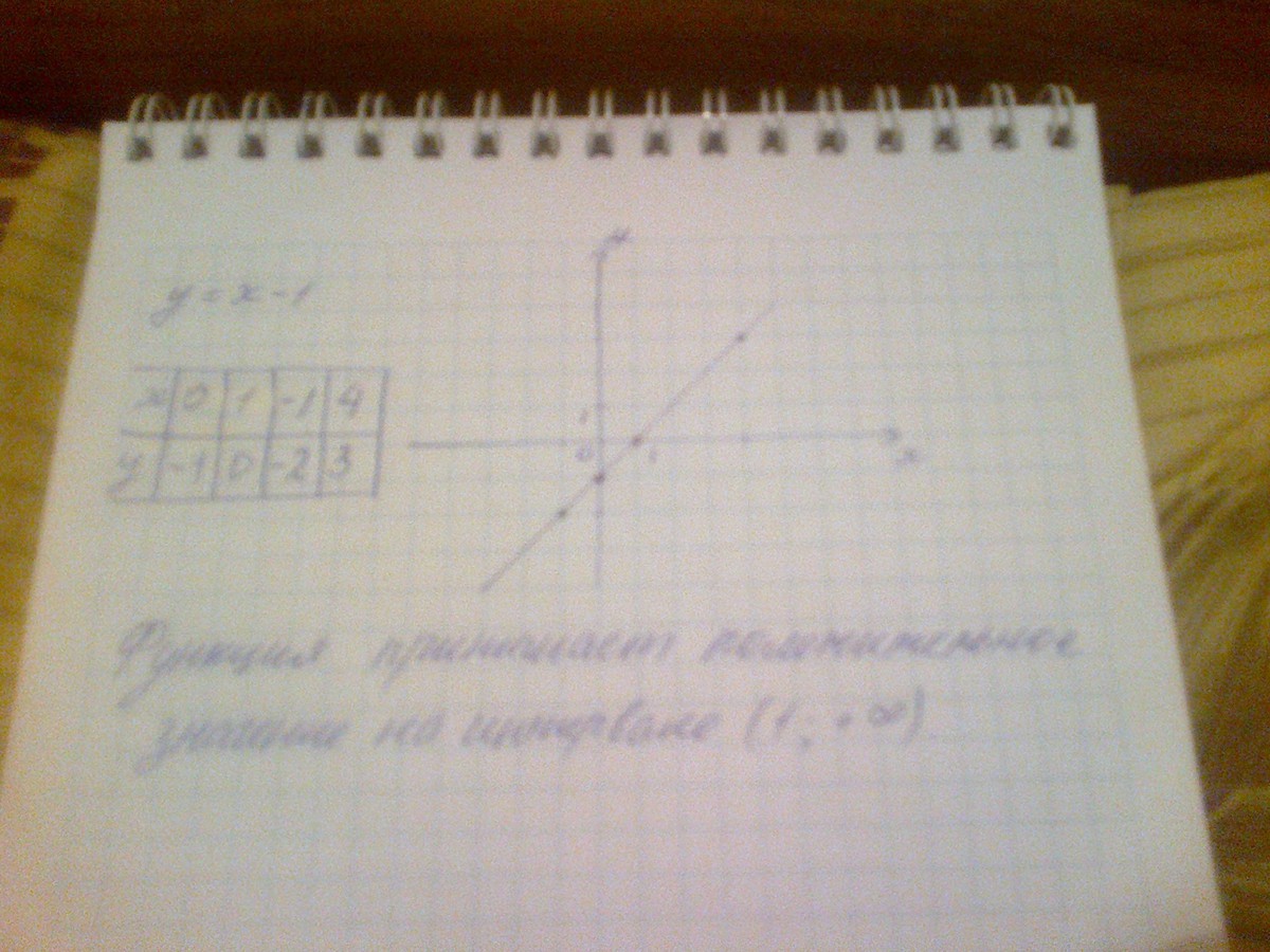 Постройте график функции y=x-1.Определите интервал,на котором функция принимает положительное значение.