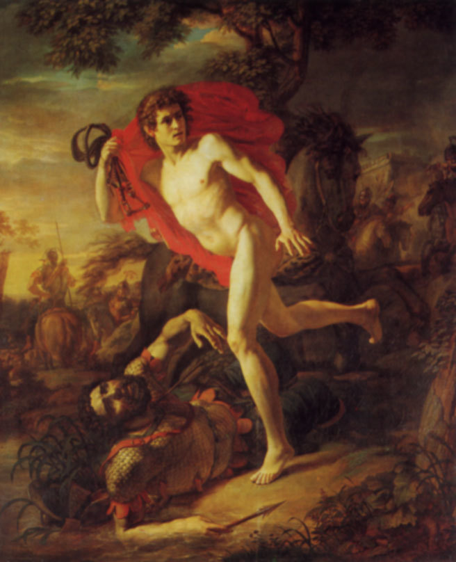 Классицизм. В центре полотна – фигура прекрасного юноши. Он светел и напоминает античных героев :мускулист,уверен в себе,отважен. Бежит босиком, держа в руках уздечку. Он - в поисках коня, говорит на языке печенегов и хочет переплыть на другой берег Днепра, чтобы попросить подмогу. Киевлянин спешит, ибо боится не успеть. В него уже летела стрела, которая попала в печенега,теперь лежащего у его ног.