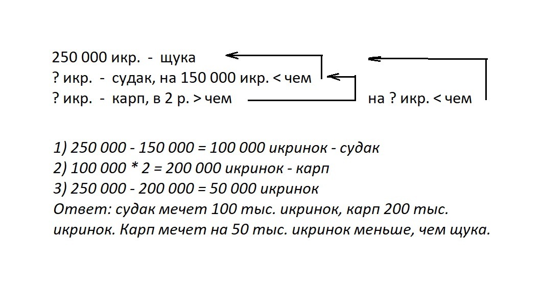 небольшая щука мечет 250 тысяч икринок. Судак - на 150 000 икринок меньше, чем щука. Карп выметывает в 2 раза больше чем судак.Сколько икринок мече каждая рыба.на сколько икринок меньше выметывает карп,чем щука?