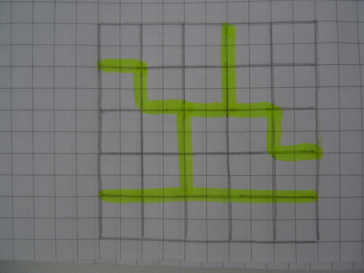 На клетчатой бумаге нарисован квадрат со стороной 5 клеток. Его требуется разбить на 5 частей одинаковой площади,проводя отрезки внутри квадрата только по линиям сетки.Сделайте это так, чтобы сумма длин всех проведенных отрезков была равна 16 клеткам.
