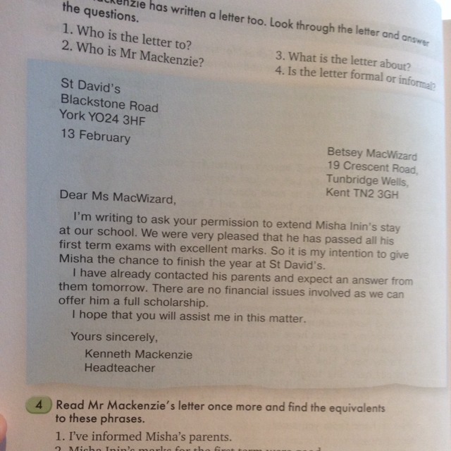 Я пишу, чтобы просить вашего разрешения продлить пребывание Миши Инина в нашей школе. Мы были очень рады, что он сдал все экзамены за первый семестр на отлично. Так что я хочу, чтобы Миша продолжал учиться в школе Сент-Дэвид.