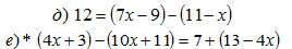е) (4x+3)-(10x-11)=7+(13-4x)