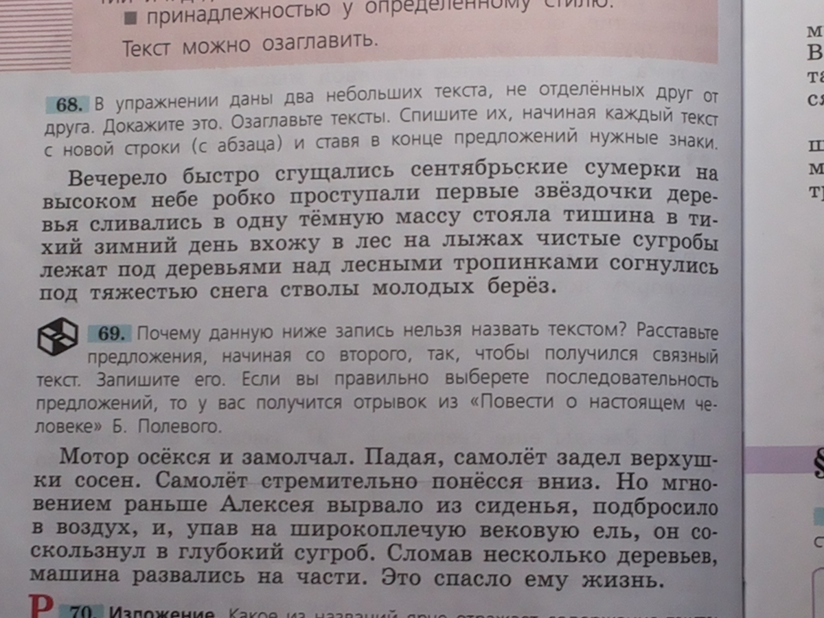1. Мотор осекся и замолчал. 2. Самолет стремительно понесся вниз. 3.Падая самолет задел верхушки сосен. 4.Сломав несколько деревьев, машина развалилась на части. 5. Но мгновением раньше Алексея вырвало из сиденья, подбросило в воздух, и,упав на широкоплечую вековую ель, он соскользнул в глубокий сугроб. 6. Это спасло ему жизнь.