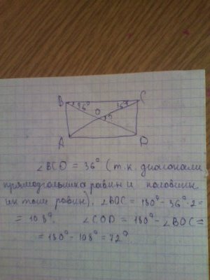 Диагональ треугольника образует с его стороной угол в 36 градусов.Найдите величину угла,образованного диагоналями и лежащего против меньшей стороны прямоугольника. Сплошной геморрой >_<