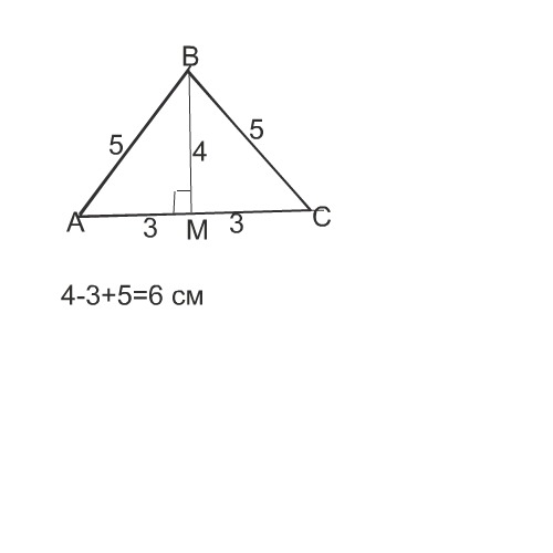 2. В равнобедренном треугольнике ABC АВ = ВС = 5 см, точка М - сере¬дина АС и ВМ = 4 см. Найдите вели¬чину |MB - МС + BA|.