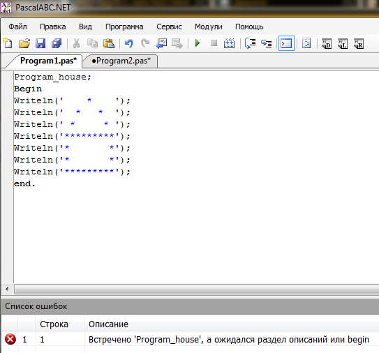 Пишет Встречено 'Program_house', а ожидался раздел описаний или begin