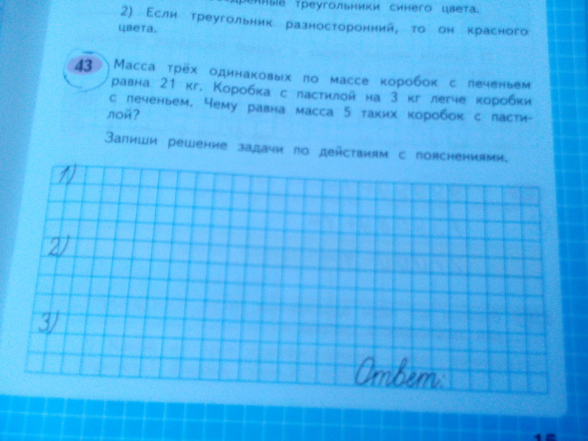 7-3=4 масса одной коробки с пастилой(масса коробки с пастилой на три меньше коробки с печеньем)