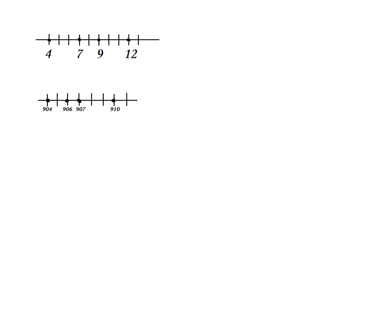 Начертите часть числового луча и отметьте на нем точки,которым соответствуют числа:1) 4,7,9,12; 2) 904,906,907,910.