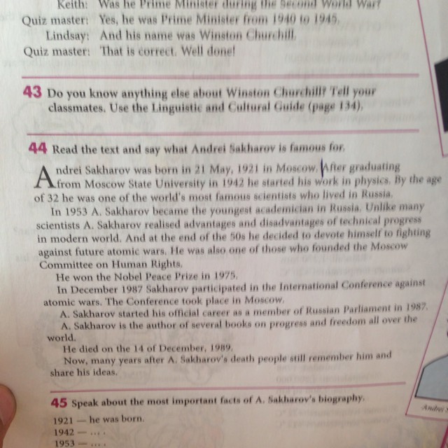 44) Прочитайте текст и скажите, чем Андрей Сахаров известен.