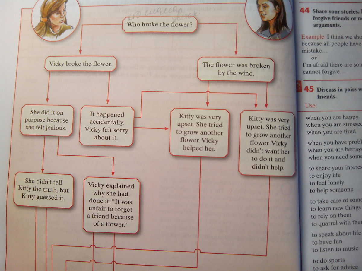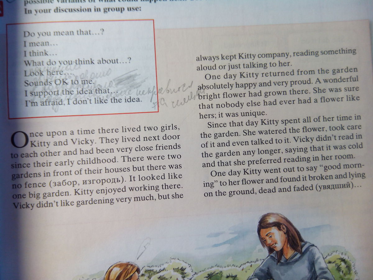 Однажды жили две девушки, Кити и Вики. Они жили ПО-соседству, напротив друг друга и были очень близкими друзьями с самого раннего детства. Было два сада перед их домами и там не было забора. Казалось, что один сад был больше. Кити любила работать там. Вики не сильно нравилось заниматься садоводством, но она всегда составляла компанию Кити, читая что-либо громко вслух или просто разговаривая с ней.Однажды Кити вернулась из сада абсолютно счастливой и очень гордой. Замечательный, яркий цветок вырос там. Она была уверена, что никто другой, когда-либо не имел такого цветка как она, он был уникальным. С того самого дня Кити проводила все свое время в саду. Она поливала цветок, заботилась о нем и даже разговаривала с ним. Вики больше не читала в саду, говоря, что уже холодно, и она предпочитала читать в своей комнате. Однажды Кити пошла, сказать «доброе утро» своему цветку и нашла его сломанным и лежащим на земле, умершим и увядшим.