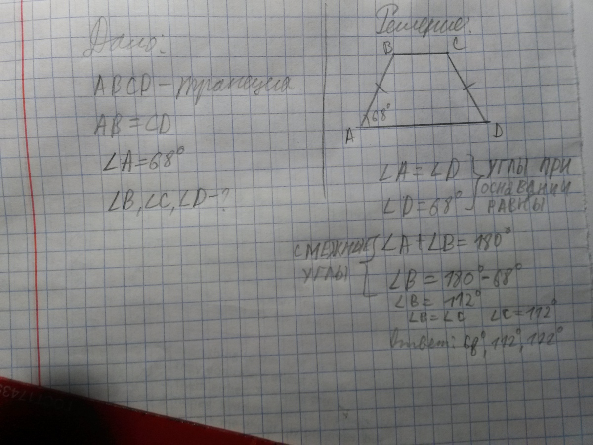Один из углов равнобедренной трапеции равен 68 градусов. Найдите остальные углы трапеции. Нужно очень, сейчас. Помогите пожалуйста