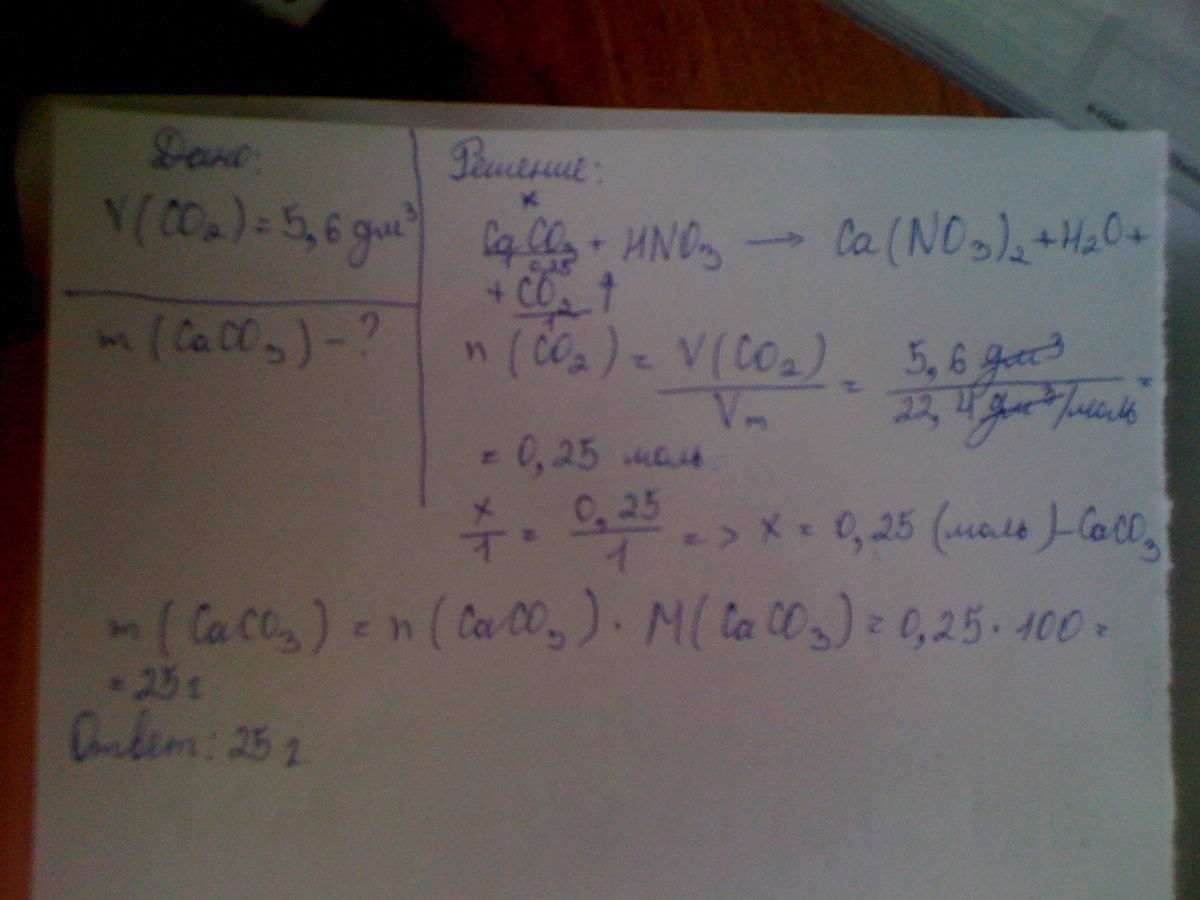 при растворении карбоната кальция в избытке азотной кислоты выделяется 5, 6 л (н.у) газа. найти массу карбоната кальция.