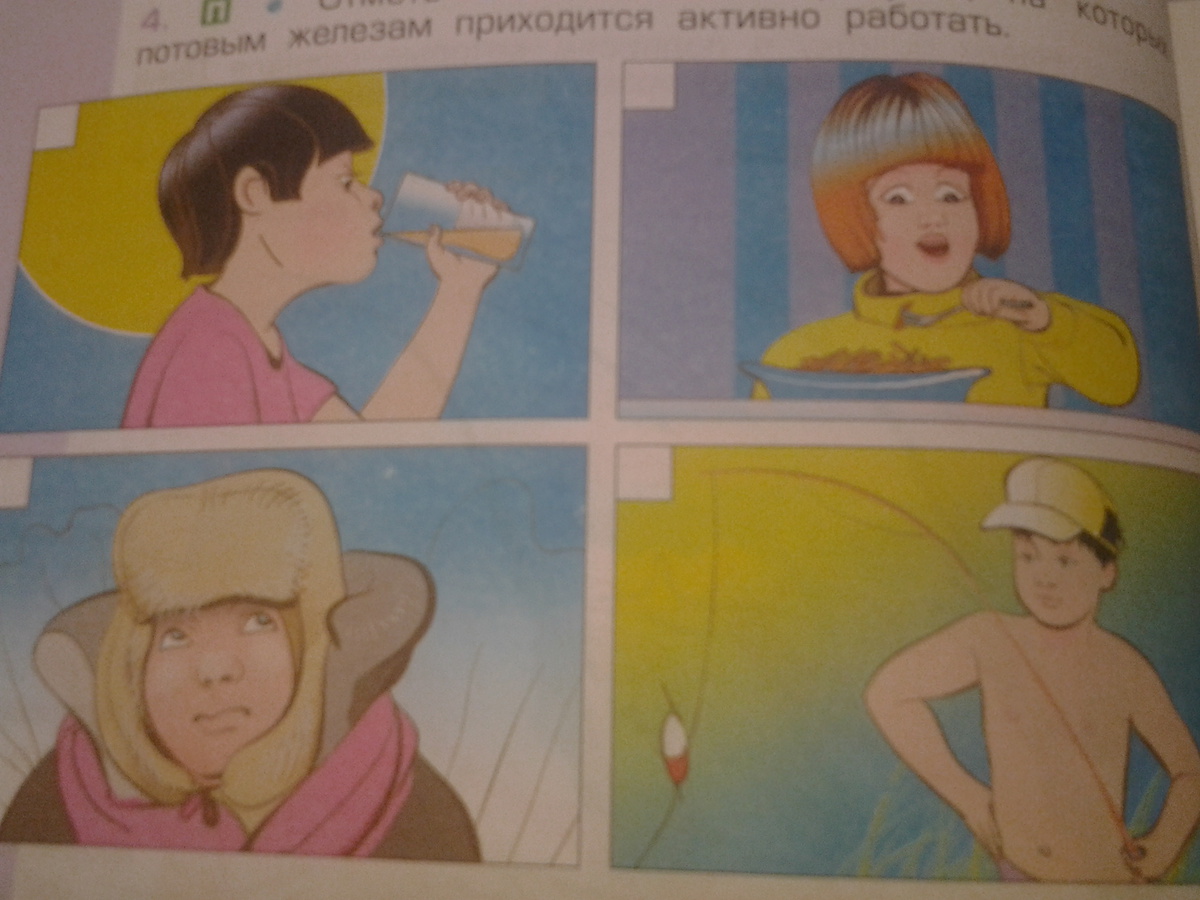 отметь знаком + те рисунки, на которых потовым железам приходится активно работать