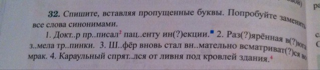 1. Доктор прописал пациенту инъекции. 2. Разъяренная вьюга замела тропинки. 3. Шофер вновь стал внимательно всматриваться во мрак. 4. Караульный спрятался от ливня под кровлей здания.