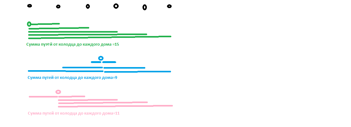 Вдоль прямой дороги стоят шесть домов. В какой точке дороги надо вырыть колодец, чтобы сумма расстояния от него до всех домов была наименьшей?