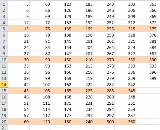 3,6,9,12,18,21,24,27,33,36,39,42,48,51,54,57, 16 штук в полтине,значит
