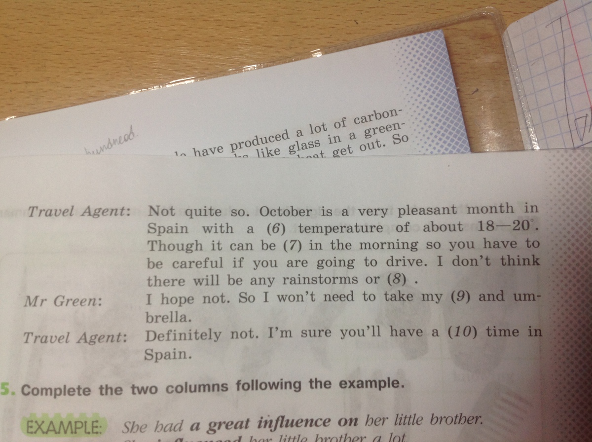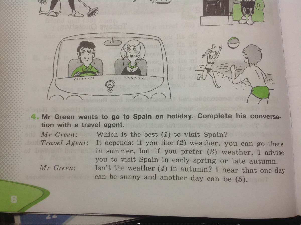 Which is the best (season / time) to visit Spain? It depends: if you like (hot) weather, you can go there in summer, but if you prefer (warm) weather, I advise you to visit Spain in early spring or late autumn. Isn't the weather (cold / bad / chilly) in autumn? I hear that one day can be sunny and another day can be (rainy / cloudy). Not quite so. October is a very pleasant month in Spain with a (day) temperature of about 18—20 Though it can be (foggy) in the morning so you have to be careful if you are going to drive. I don't think there will be any rainstorms or (thunderstorms) . I hope not. So I won't need to take my (raincoat / cape) and umbrella. Definitely not. I'm sure you'll have a (good / wonderful) time in Spain.