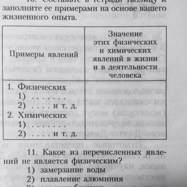 необходимо написать в 1 колонке примеры физических и химических процессов, физ процессы-это явления, в результате которых изменяются размеры и т.д кроме состава(пример:испарение и замерзание воды),хим процессы-это явления, в результате которых образуются новые вещества (пример:растворимость сахара в воде). А во второй колонке надо написать, где это встречалось тебе в жизни или же ,как это человек использует это себе на благо