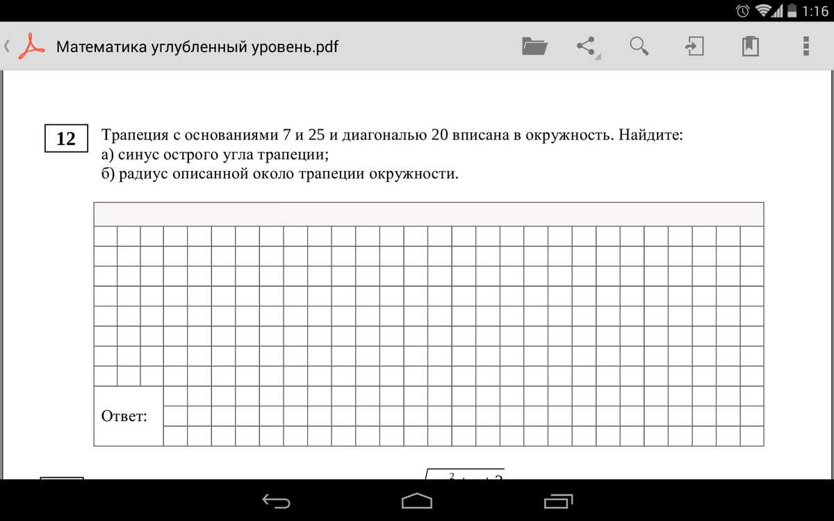 Высота трапеции равна √(20²-(((25-7)/2)+7)²) = √(400-256) = 12.