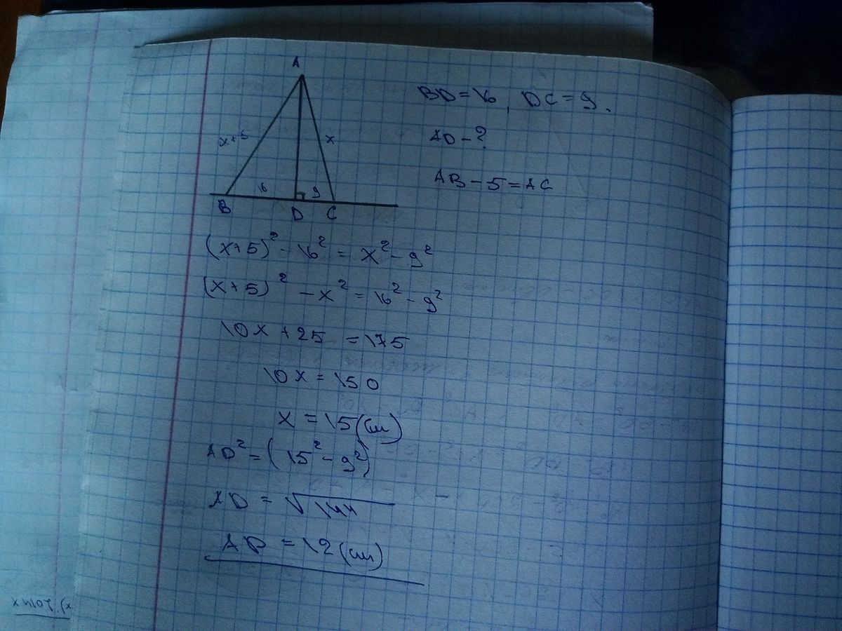з точки до прямої проведено дві похилі, проекції яких на пряму дорівнюють 9 см і 16 см. Знайдіть відстань від точки до прямої, якщо одна щ похилих на 5 си більша за другу