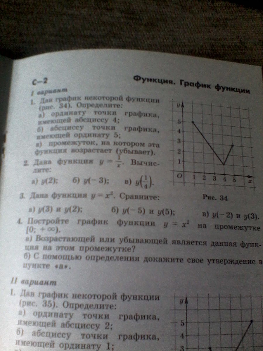 1). а. 1; б. 1; в. Функция возрастает при x ∈ ( 4; 5 ]. 2). а. у= 1/2; б. у=1:(-3)= -1/3; в. у=1:(1/4)=4. 3). у(3)=9, у(2)=4; 9>4. у(-5)=у(5)= 25. у(-2)<у(3), т. к. 2<3. 4). по определению функции каждому значению х соответствует единственное значение функции y , которое равно x 2.