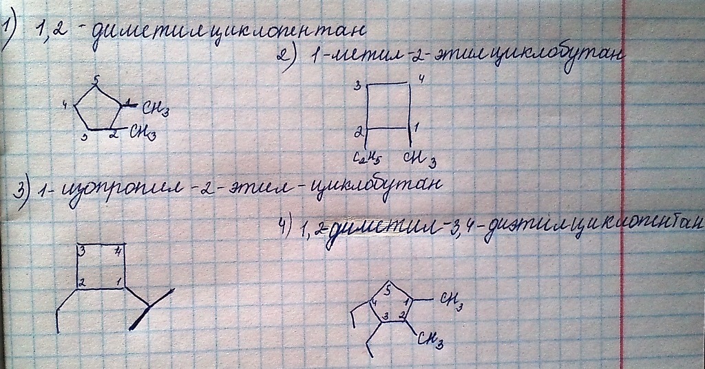 Помогите пожалуйста!Составьте формулы веществ 1)1,2 диметилциклопентана. 2) 1 метил 2 этилциклобутана. 3)1 изопропил 2 этилциклобутана. 4)1,2 диметил 3,4 диэтилциклопентана