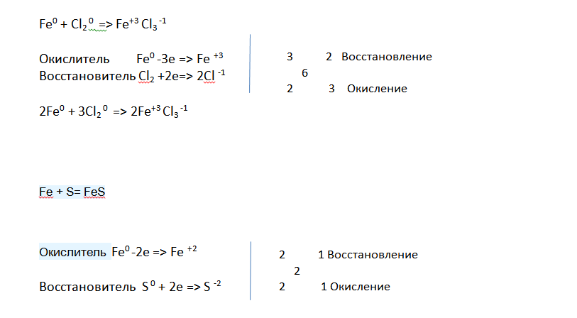 Fe0 + Cl2 0 => Fe+3 Cl3 -1