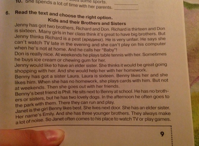 У Дженни два брата, Ричард и Дон.Ричарду 13, а Дону 16. Многие девочки в её классе считают, что иметь двух старших братьев здорово. Но Дженни считает, что Ричард вредина.Он очень нечестный. Он говорит, что ей нельзя смотреть телевизор поздно вечером и играть на компьютере, когда его нет дома. И он называет её "деткой"!