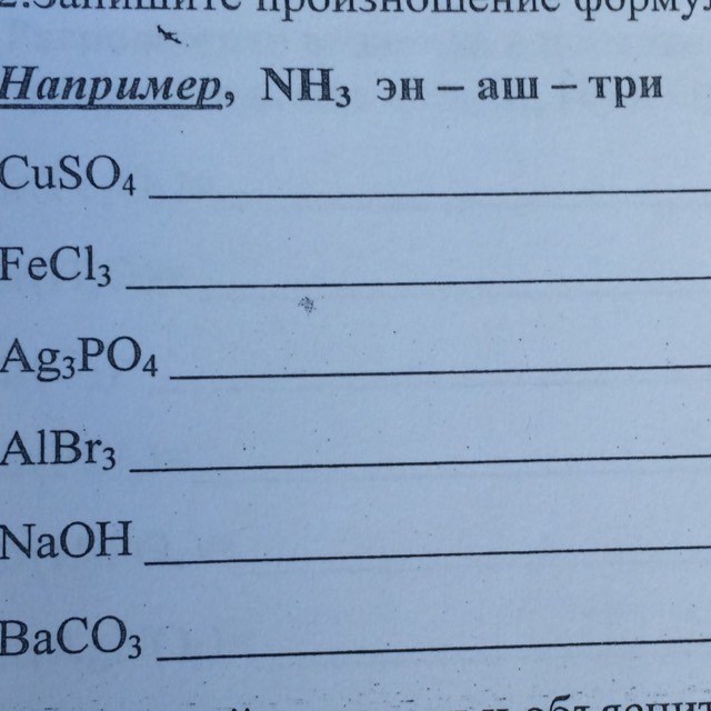 купрум-эс-о-четыре, ферум-хлор-три, аргентум-три-пэ-о-четыре, алюминий-бром-три, натрий-о-аш, барий-це-о-три.