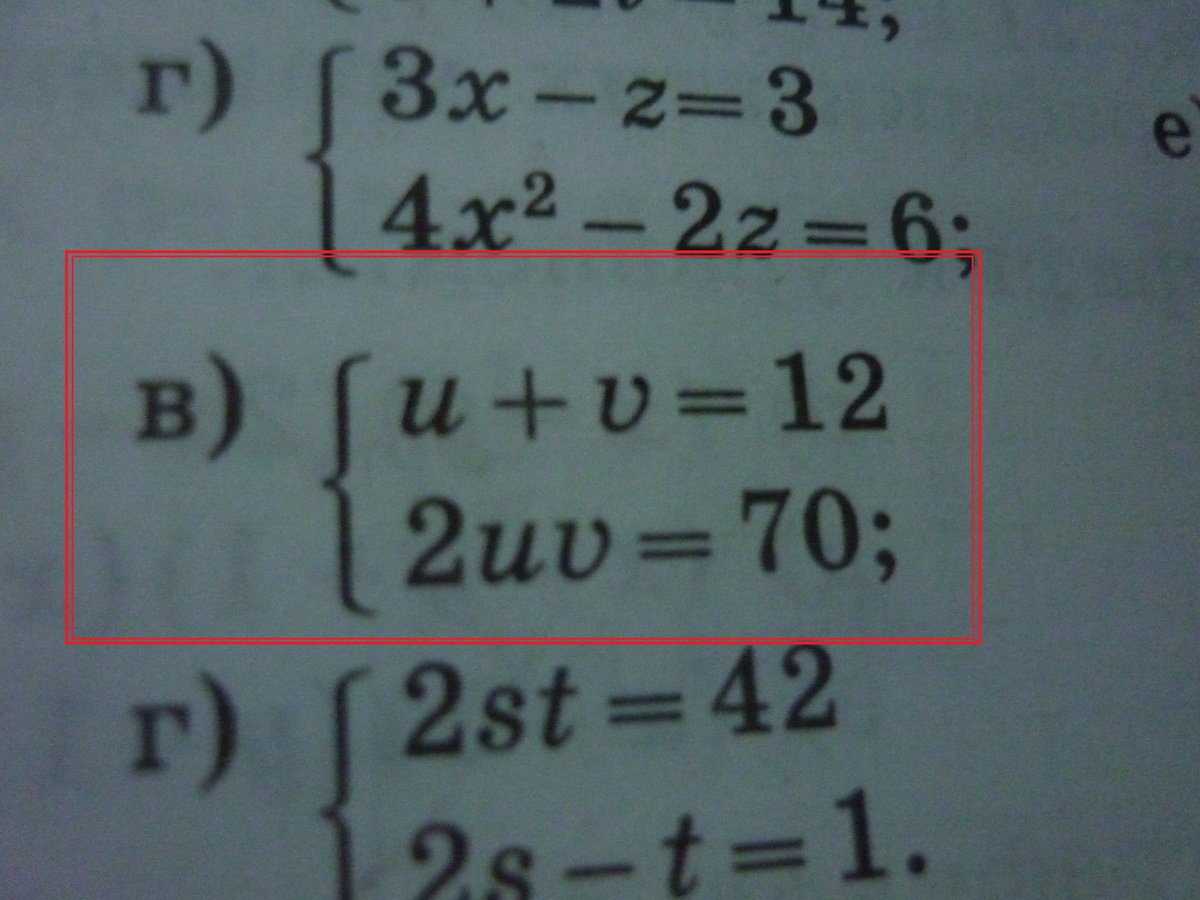 1-е ур-е: u=12-v ; 2*(12-v)*v=70; (24-2*v)*v=70; 24*v-2v^2=70; 2v*v-24v+70=0; D=b^2-4*a*c; D=24^2-4*2*70; D=576-560; D=16; x1,2=-b+или- Корень из D/2*a; x1=(24+4)/4; x1=7; x2=(24-4)/4; x2=5