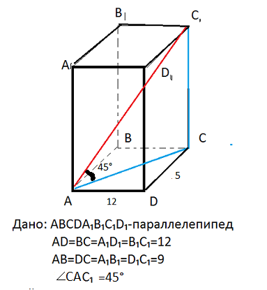 В прямоугольном параллелепипеде стороны основания равны 12 и 5 см.диагональ пар-да образует с плоскостью основания угол 45 градусов. Найти боковое ребро пар-да.