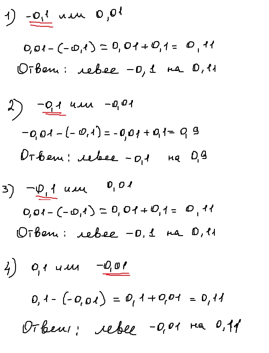 определите,какое из данных чисел расположено на координатной прямой левее и на сколько?-0,1 или 0,01; -0,1 или -0, 01; -0,1 или 0,01; 0,1 или -0,01. И если можете-подскажите тему пожалуйста, я не была на уроке по болезни(