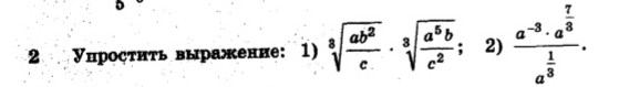 sqrt[3]{frac{ab^2}{c}}cdot sqrt[3]{frac{a^5b}{c^2}}=sqrt[3]{frac{ab^2}{c}cdot frac{a^5b}{c^2}}=sqrt[3]{frac{a^6b^3}{c^3}}=frac{a^2b}{c}\\\frac{a^{-3}cdot a^{frac{7}{3}}}{a^{frac{1}{3}}}=a^{-3+frac{7}{3}-frac{1}{3}}=a^{-3+2}=a^{-1}=frac{1}{a}
