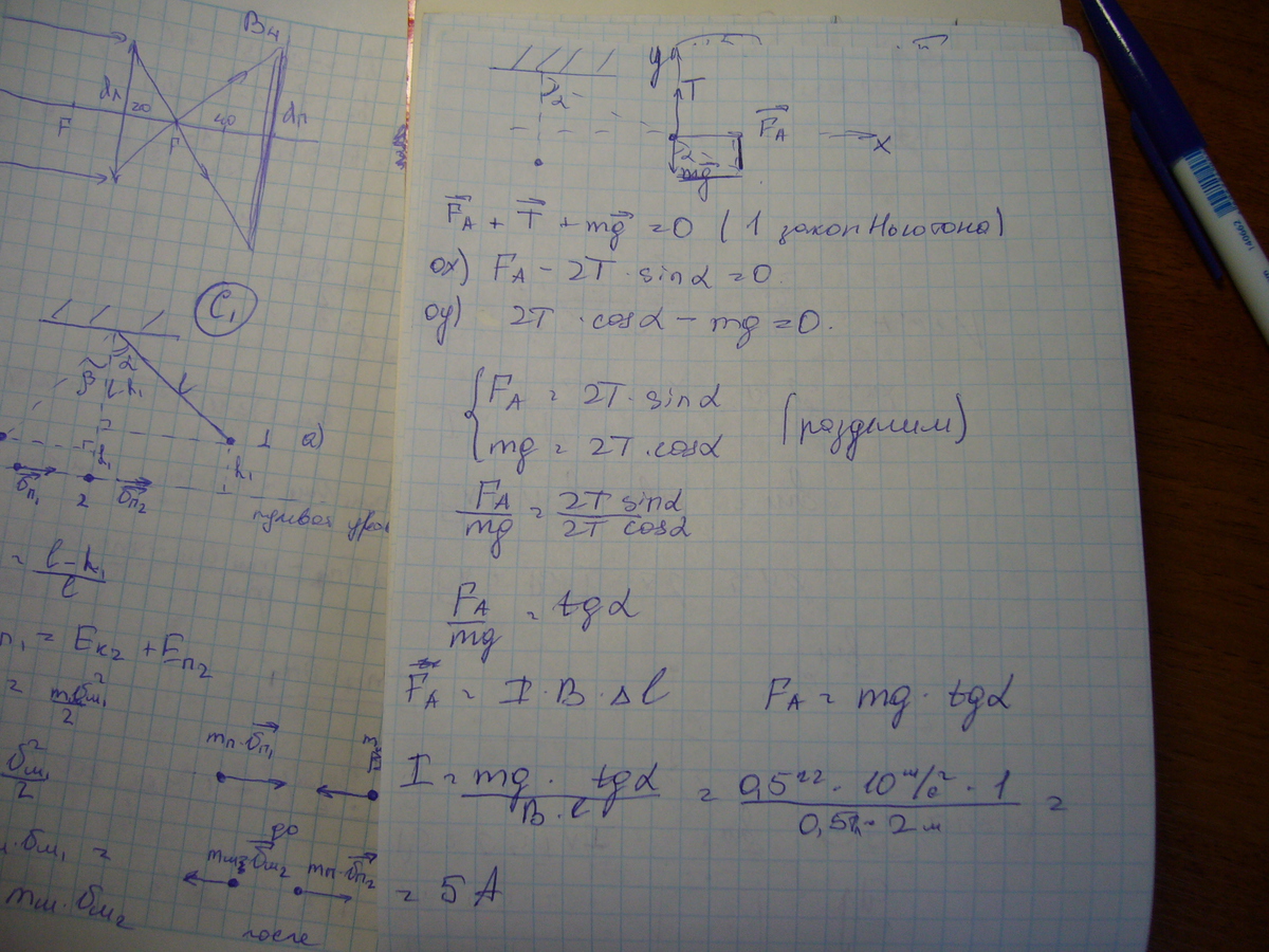 На двух нитях висит горизонтально расположенный стержень длиной 2 м и массой 0.5 кг. Стержень находиться в однородном магнитном поле, индукция которого 0.5 Тл и направлена вниз. Какой ток нужно пропустить по стрежню, чтобы нити отклонились от вертикали на 45градусов?