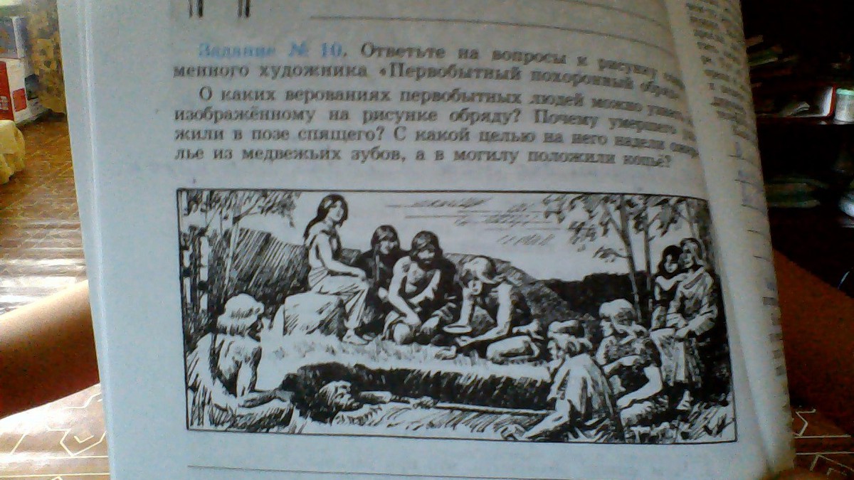 Ответьте на вопросы к рисунку современного художника "Первобытный похоронный обряд"