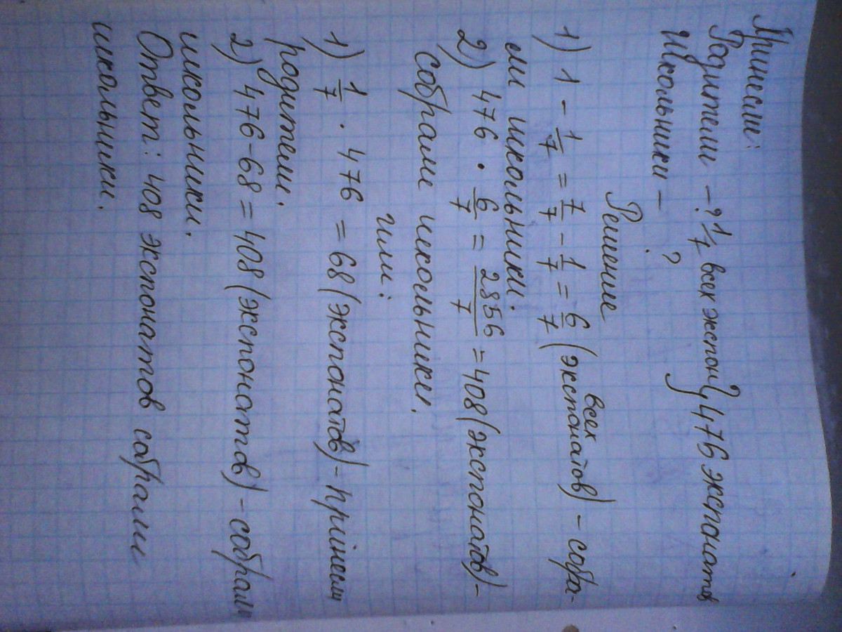 В школьном музее народных ремёсел 476 эспонатов .Одну седьмую часть всех экспонатов принесли родители,а остальные собрали сами школьники.Сколько экспонатов собрали школьники?