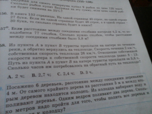 из пункта а в пункт в туристы проплыли на катере по течению реки а обратно вернулись на теплоходе . Скорость течения 2км/ч собственная скорость теплохода 26км/ч . Отношение собственной скоростикатера к собственной скорости теплохода равно 8 : 13 . Путь из пункта а в пункт в на катере туристы проплылиза 3,6 ч. Сколько часовим потребовалось на обратный путь на теплоходе?